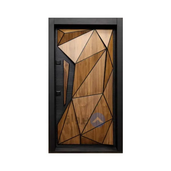 • نقش چوب و ترمووود: ترکیب رنگ مشکی با گرمای چوب طبیعی یا ترمووود، تضاد بصری زیبایی ایجاد می‌کند. یک درب ضد سرقت مشکی قهوه‌ای (درب ضد سرقت ترموود) که در آن از پنل‌های ترمووود استفاده شده، به دلیل مقاومت بالای ترمووود در برابر رطوبت و آفتاب، برای ورودی ویلاها گزینه‌ای ایده‌آل است.